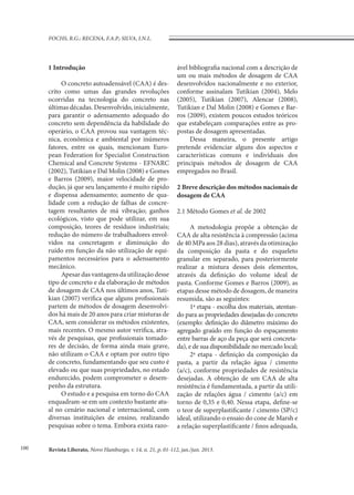 O documento descreve métodos experimentais de dosagem de concreto autoadensável (CAA) desenvolvidos no Brasil. Dois grupos de métodos são descritos: um baseado na avaliação separada da pasta e agregados e outro avaliando o concreto como um todo. Três métodos específicos são detalhados: o método Gomes et al. de 2002, o método Repette e Melo de 2005 e o método Tutikian de 2004.