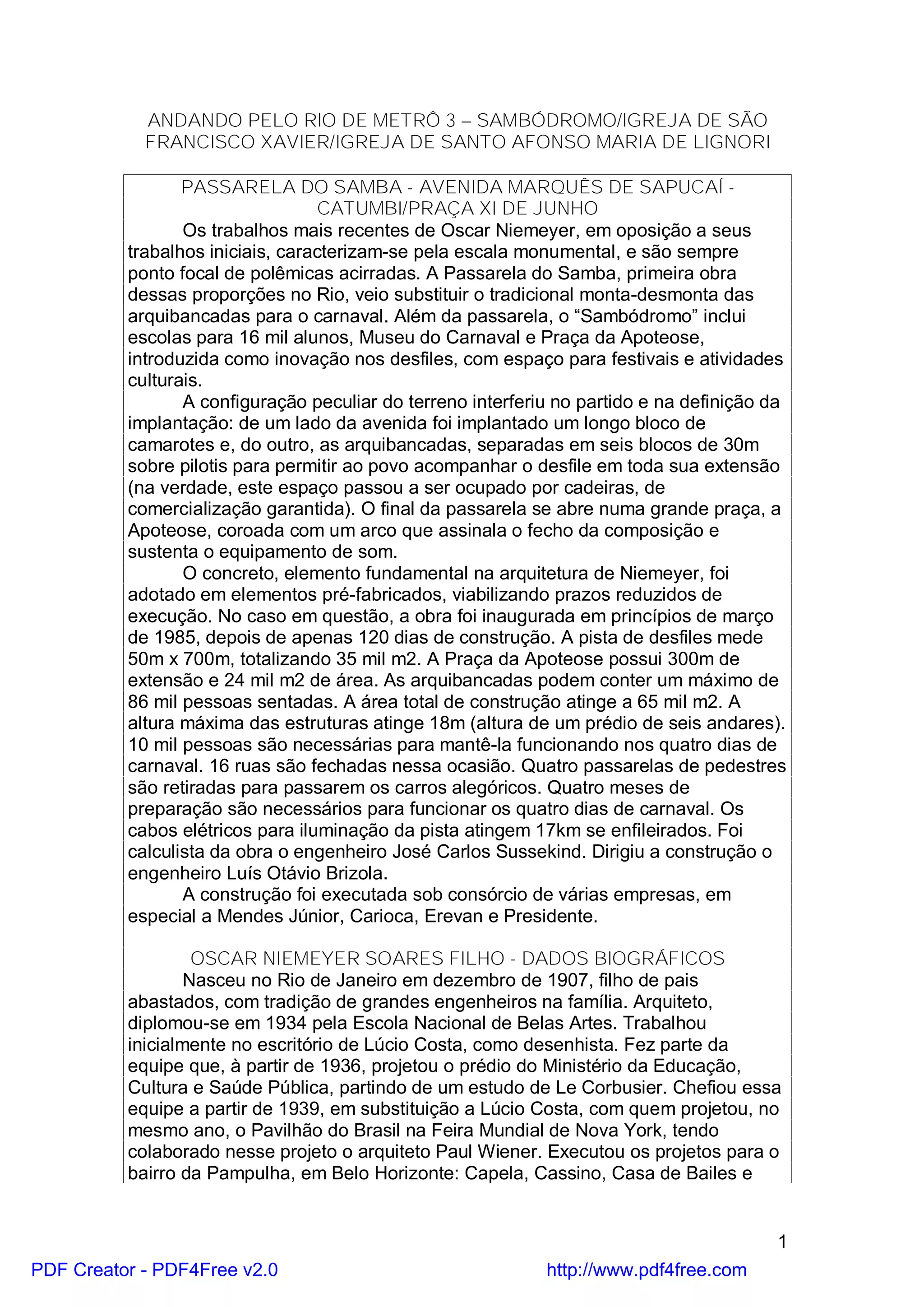O documento descreve a construção do Sambódromo no Rio de Janeiro, projetado por Oscar Niemeyer em apenas 120 dias em 1985 para abrigar os desfiles de carnaval. Também fornece detalhes sobre a Igreja de São Francisco Xavier no bairro do Engenho Velho e a Igreja de Santo Afonso Maria de Lignori no bairro da Tijuca.