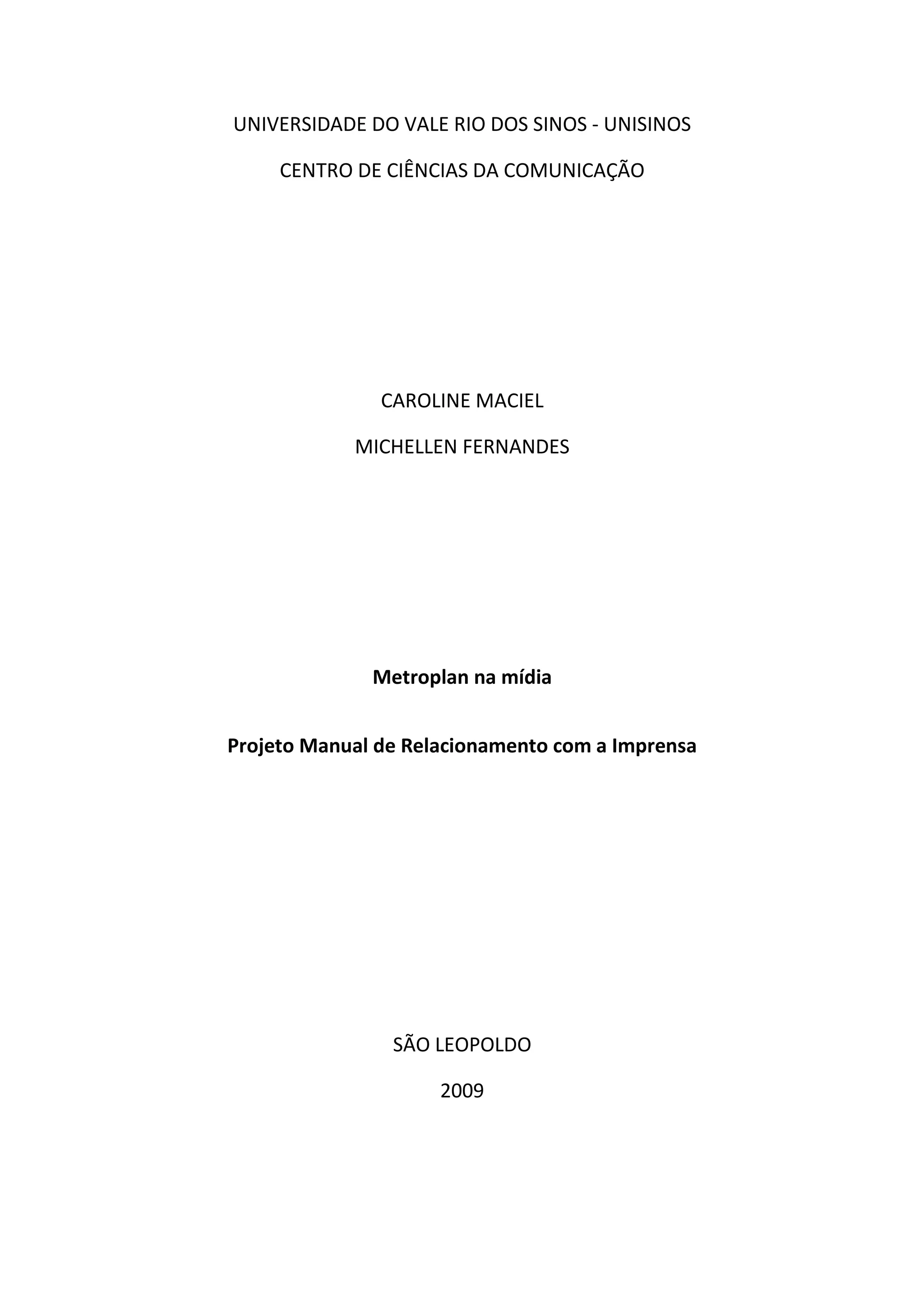 Este documento apresenta um projeto para sistematizar o relacionamento entre a Metroplan e a mídia através da criação de um manual de relacionamento com a imprensa. O projeto visa conscientizar os funcionários da Metroplan sobre a importância deste relacionamento e prepará-los para interagir de forma efetiva com a mídia por meio de treinamentos e visitas às redações. O manual será elaborado em três meses e os treinamentos ocorrerão no mês seguinte, avaliando-se a eficácia do projeto a cada seis meses.