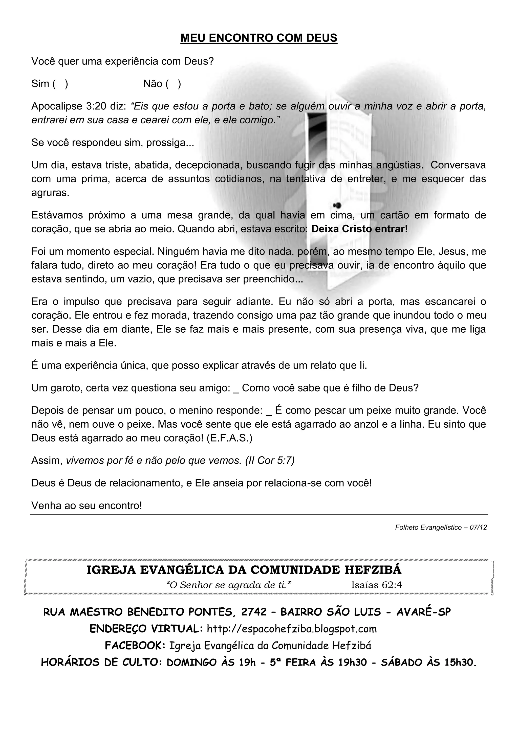 O documento descreve a experiência de uma mulher que se sentia triste e decepcionada até que encontrou um cartão com a mensagem "Deixa Cristo entrar". Isso a levou a abrir seu coração para Jesus e trazer uma grande paz interior. Ela compara essa experiência com a sensação de ter Jesus agarrado ao seu coração como um peixe grande na linha.