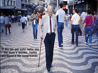 O documento é uma carta de um idoso para seu filho pedindo paciência e compreensão com os desafios do envelhecimento, como esquecimento e perda de habilidades. Ele pede que o filho o trate com amor e o ajude como fez no passado, da mesma forma que o idoso o ajudou quando criança.