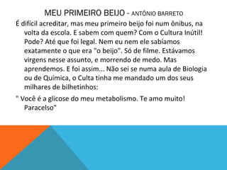 O texto narra a história do primeiro beijo do autor com um colega de escola chamado Cultura Inútil no ônibus após a aula. O Cultura Inútil declara seu amor pelo autor e lista fatos sobre beijos antes de iniciar um beijo tímido no ônibus, marcando a experiência de ambos. Eles ficam juntos por algumas semanas após o incidente.