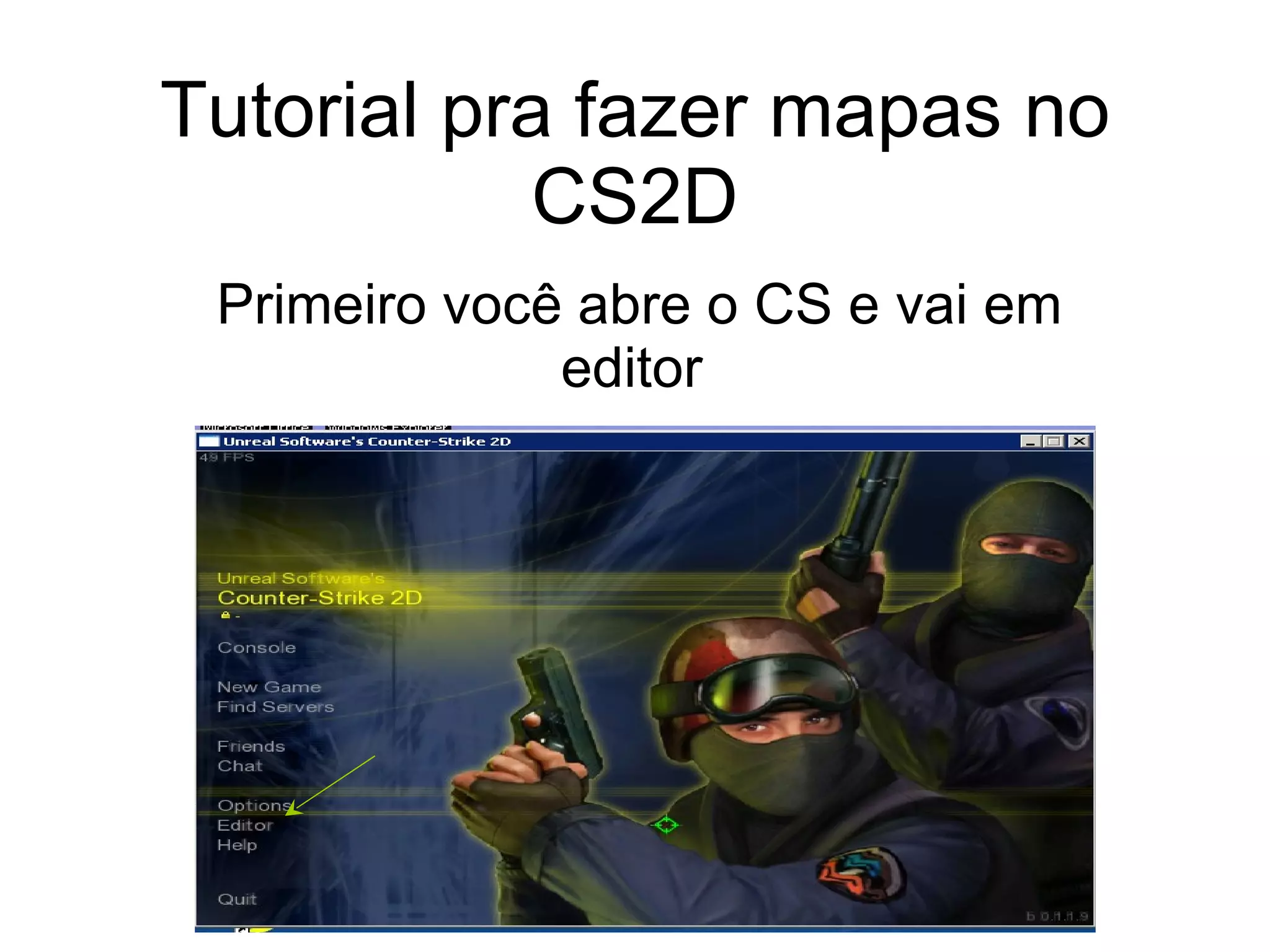 Este tutorial ensina como criar mapas no jogo CS2D usando o editor: abra o editor, escolha as dimensões do mapa, coloque paredes e chão para definir a área jogável.
