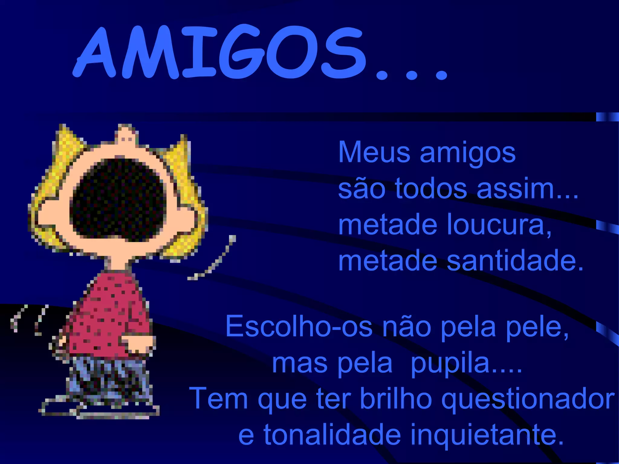 O poema descreve o tipo de amigos que o autor valoriza: aqueles que o desafiam e o fazem questionar-se, trazendo dúvidas e angústias, mas também apoio; que o aceitam tanto na sua pior parte como na sua maior alegria; e que mantêm tanto a inocência e espontaneidade da infância como a sabedoria da velhice.