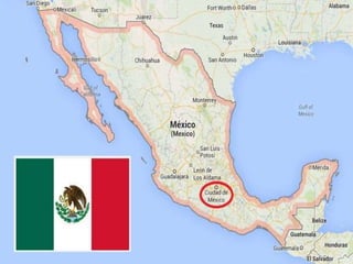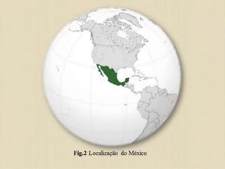O documento oferece informações sobre o México, incluindo dados demográficos, como uma população de 118.395.054 habitantes e uma área de 1.972.547 km². Também menciona o índice de desenvolvimento humano de 0,756 e destaca aspectos culturais, como pratos típicos e monumentos, incluindo Chichén Itzá.