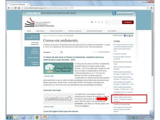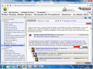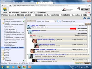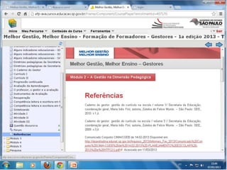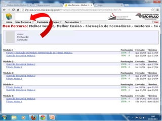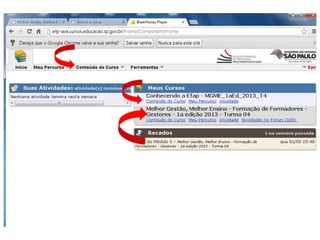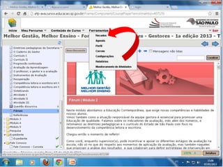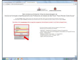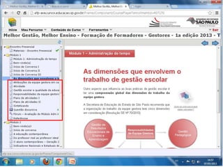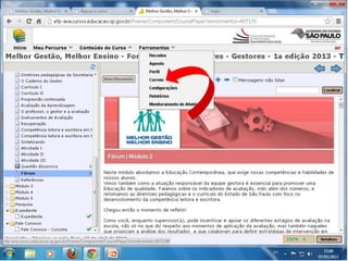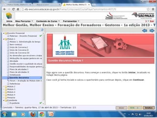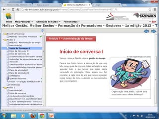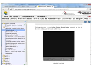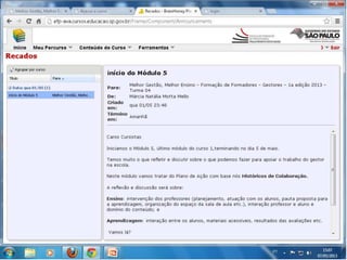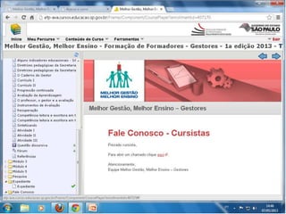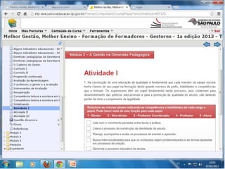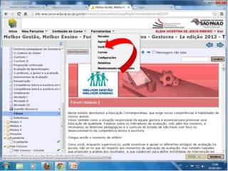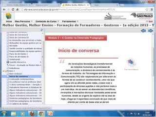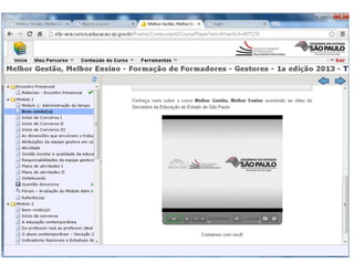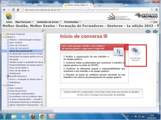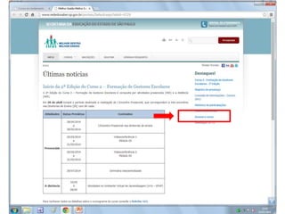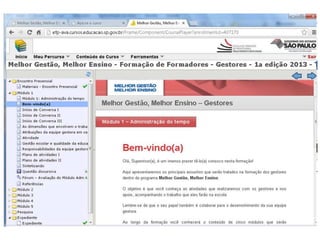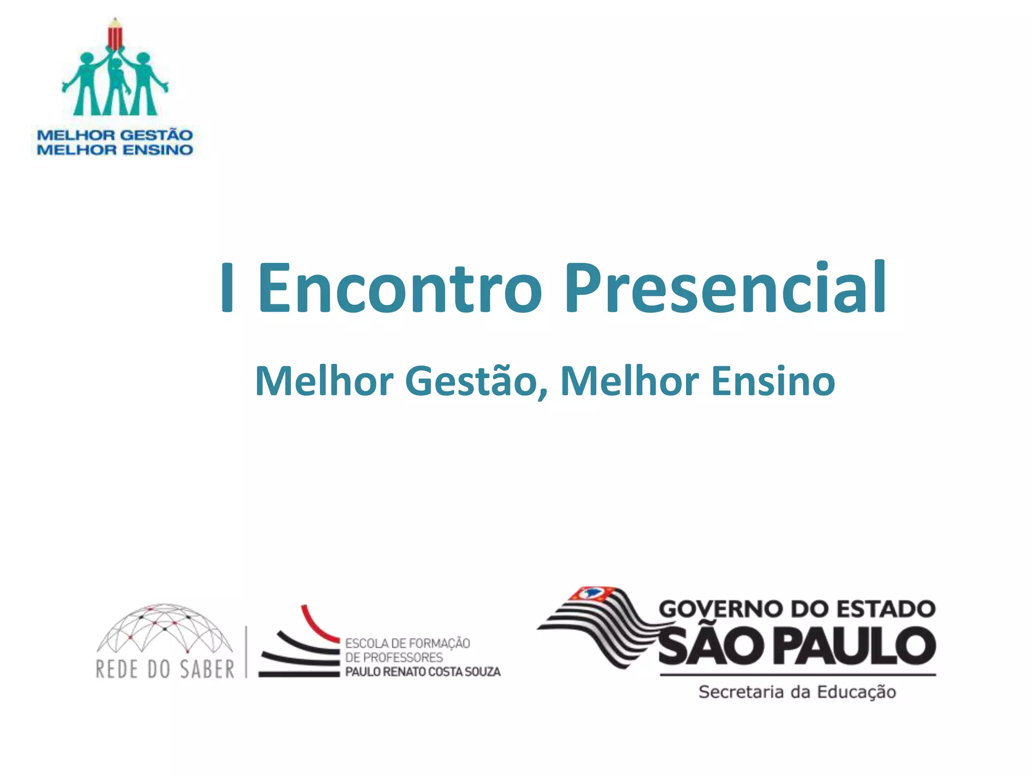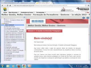 O documento descreve um encontro presencial sobre melhor gestão e ensino, fornecendo o endereço do site da escola de formação e instruções sobre como acessá-lo, além de dar boas-vindas aos participantes.