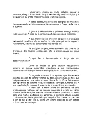 1) O documento discute os conceitos de miasmas de acordo com Hahnemann, incluindo as três principais miasmas: psora, sycose e syphilis.