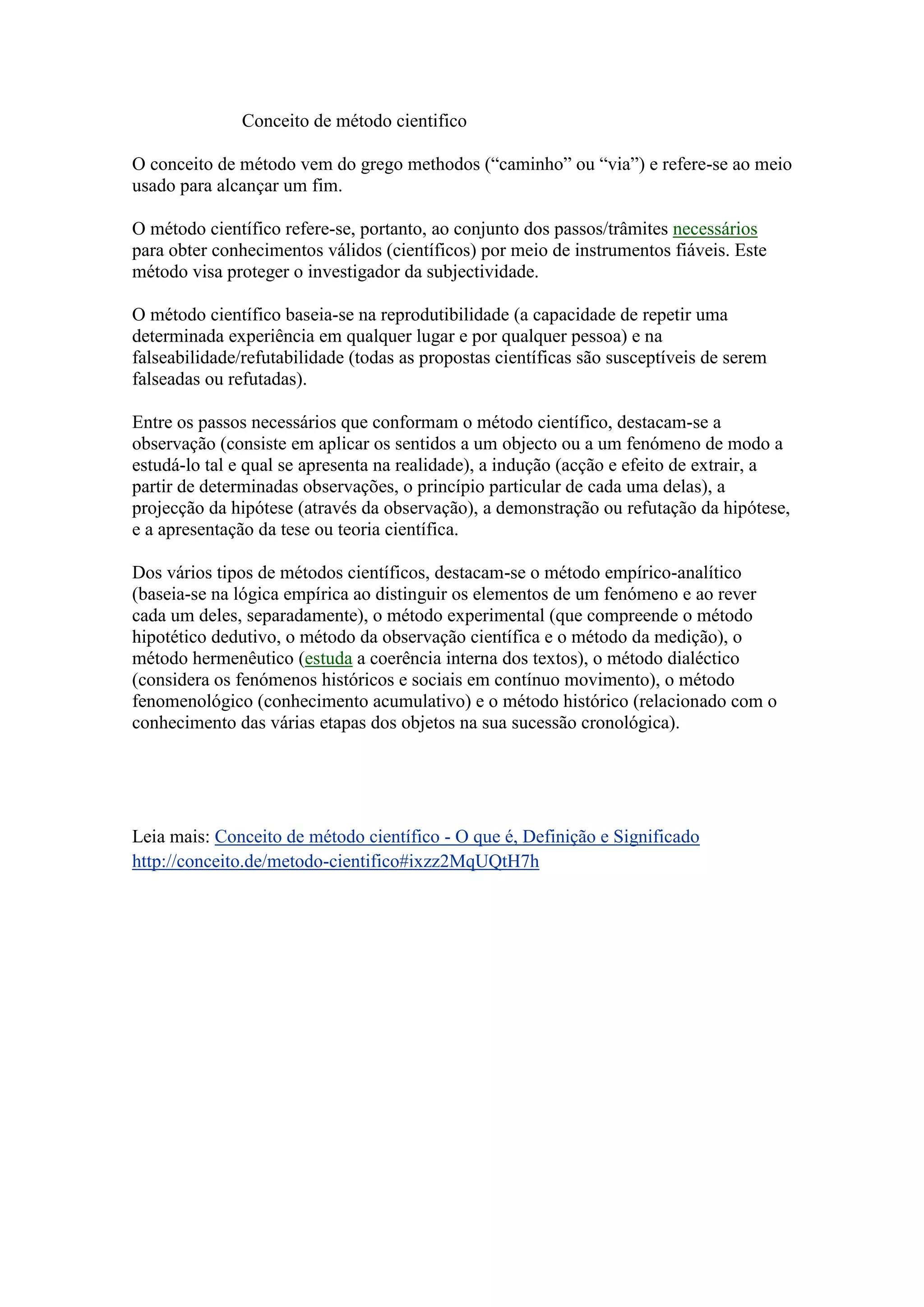 O método científico refere-se aos passos necessários para obter conhecimentos válidos através de instrumentos fiáveis, protegendo o investigador da subjetividade. Estes passos incluem a observação, indução, hipótese, demonstração ou refutação da hipótese e apresentação da teoria. Existem vários tipos de métodos científicos como o empírico-analítico, experimental e hermenêutico.