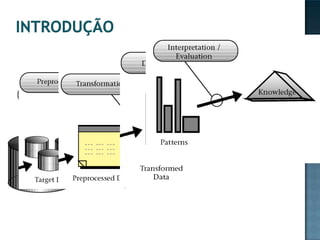 O documento discute mineração de dados, definindo-a como a aplicação de algoritmos para extrair padrões e informações relevantes dos dados. Apresenta exemplos de uso em marketing, finanças, telecomunicações e medicina. Explica três algoritmos implementados no Microsoft Data Mining: regras de associação, clustering e árvore de decisão.