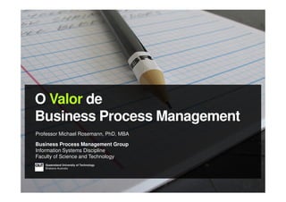 O documento discute a importância da gestão do valor no Business Process Management (BPM). Aponta que é necessário focar nos valores agregados para a organização, e não apenas nas atividades e impactos do BPM. Também ressalta a importância de identificar os stakeholders e os tipos de valor relevantes, além de direcionar as atividades de BPM, como modelagem e análise de processos, considerando a geração de valor.