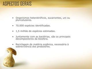 O documento descreve os principais aspectos dos fungos, incluindo sua classificação em cinco filos principais (Chytridiomycota, Zygomycota, Ascomycota, Basidiomycota e Deuteromycota), as micoses que podem causar, como micoses superficiais, subcutâneas e sistêmicas, e os principais gêneros fúngicos responsáveis por infecções.