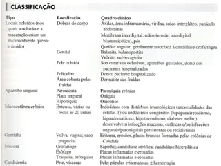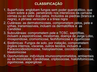 O documento classifica e descreve as micoses superficiais, incluindo: