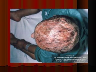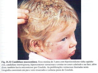 2) Dermatofitose envolvem pelos, pele e unhas, transmitidas por contato, incluindo gêneros Trichophyton, Microsporum e Epidermophyton.