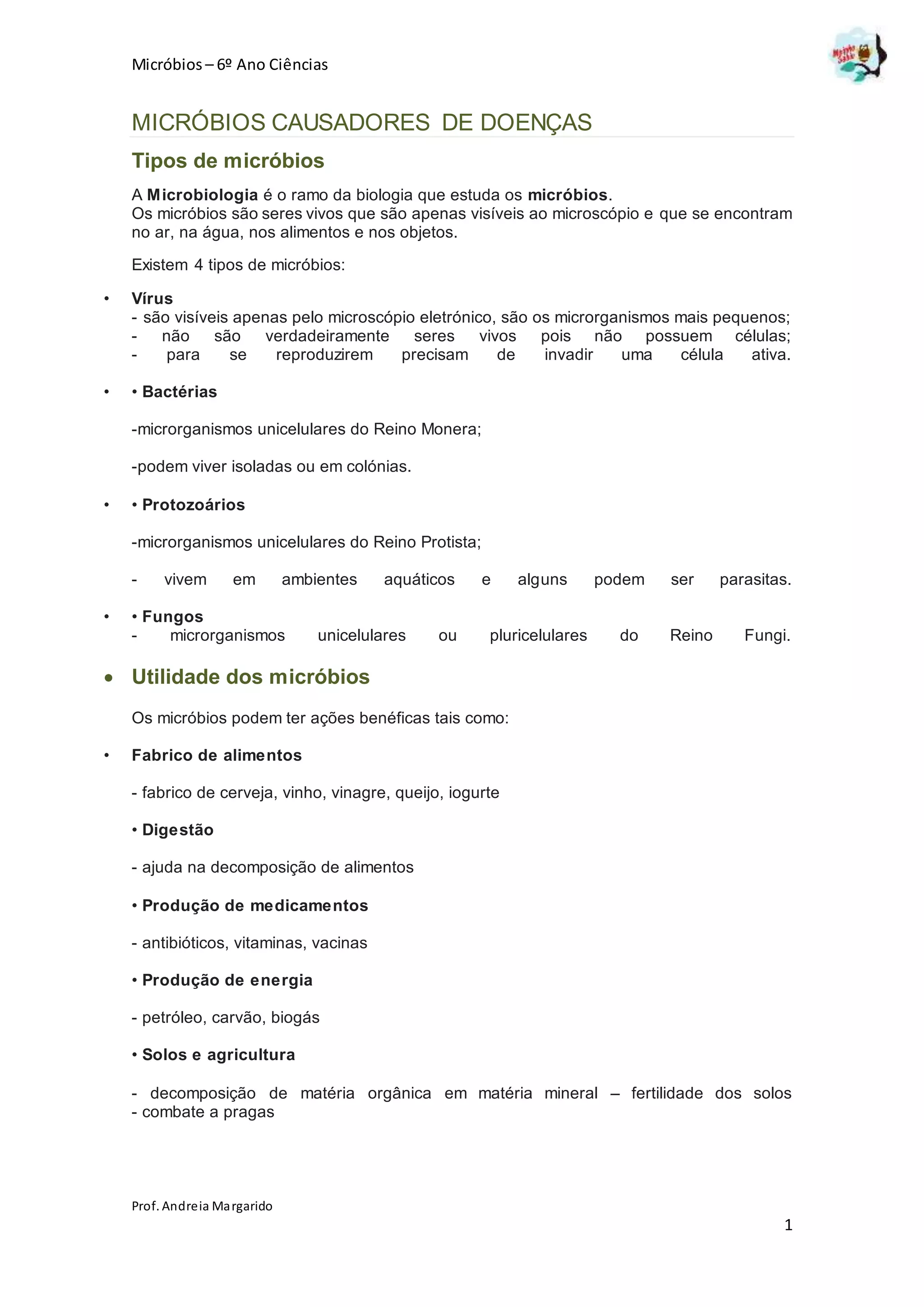 O documento discute os tipos de micróbios, incluindo vírus, bactérias, protozoários e fungos. Também descreve os micróbios patogênicos que causam doenças em humanos e plantas, bem como as defesas do organismo contra infecções e formas de prevenção como esterilização, desinfecção e vacinação.