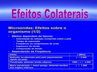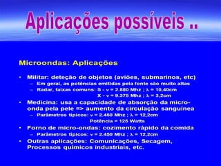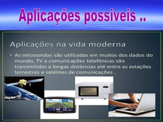 O documento discute as micro-ondas, incluindo sua descoberta acidental durante a Segunda Guerra Mundial, aplicações como fornos de micro-ondas e comunicações, e como interagem com moléculas polares como a água.