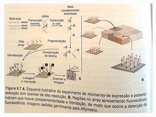 Microarrays são coleções de pontos microscópicos com DNA que permitem a análise de moléculas-alvo por meio da hibridização. A metodologia envolve hibridização, aquisição de imagem e análise de dados, sendo utilizada em diversas aplicações, como análise de expressão gênica, diagnóstico de doenças e farmacogenômica. O desenvolvimento começou entre 1980 e 1990, com Edwin Southern e a primeira empresa sendo a Affymetrix.