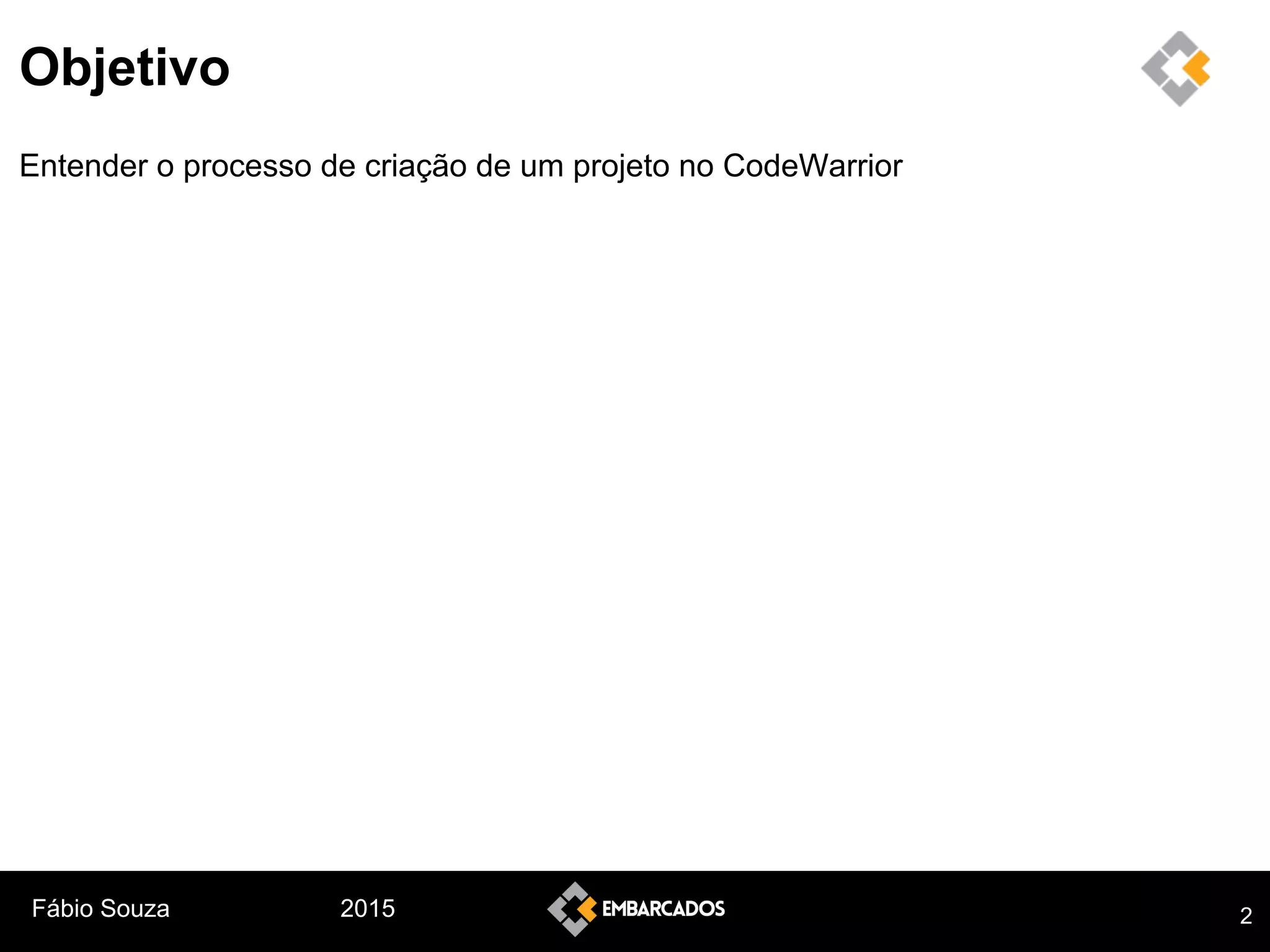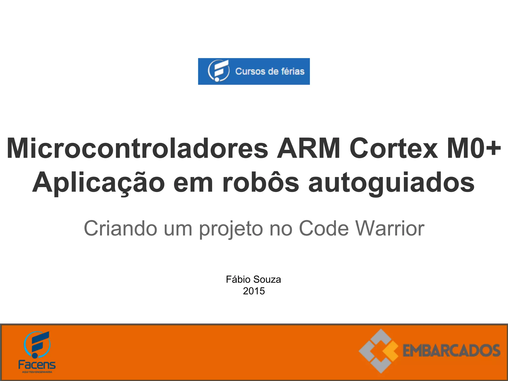 O documento de Fábio Souza de 2015 aborda o processo de criação de um projeto no CodeWarrior para microcontroladores ARM Cortex M0+, com foco em robôs autoguiados. Ele descreve etapas como a inicialização de um novo projeto, seleção de microcontrolador, configuração de ferramentas e linguagem de programação. O texto também menciona a perspectiva de programação e debug, ressaltando que o Processor Expert não será utilizado neste curso.