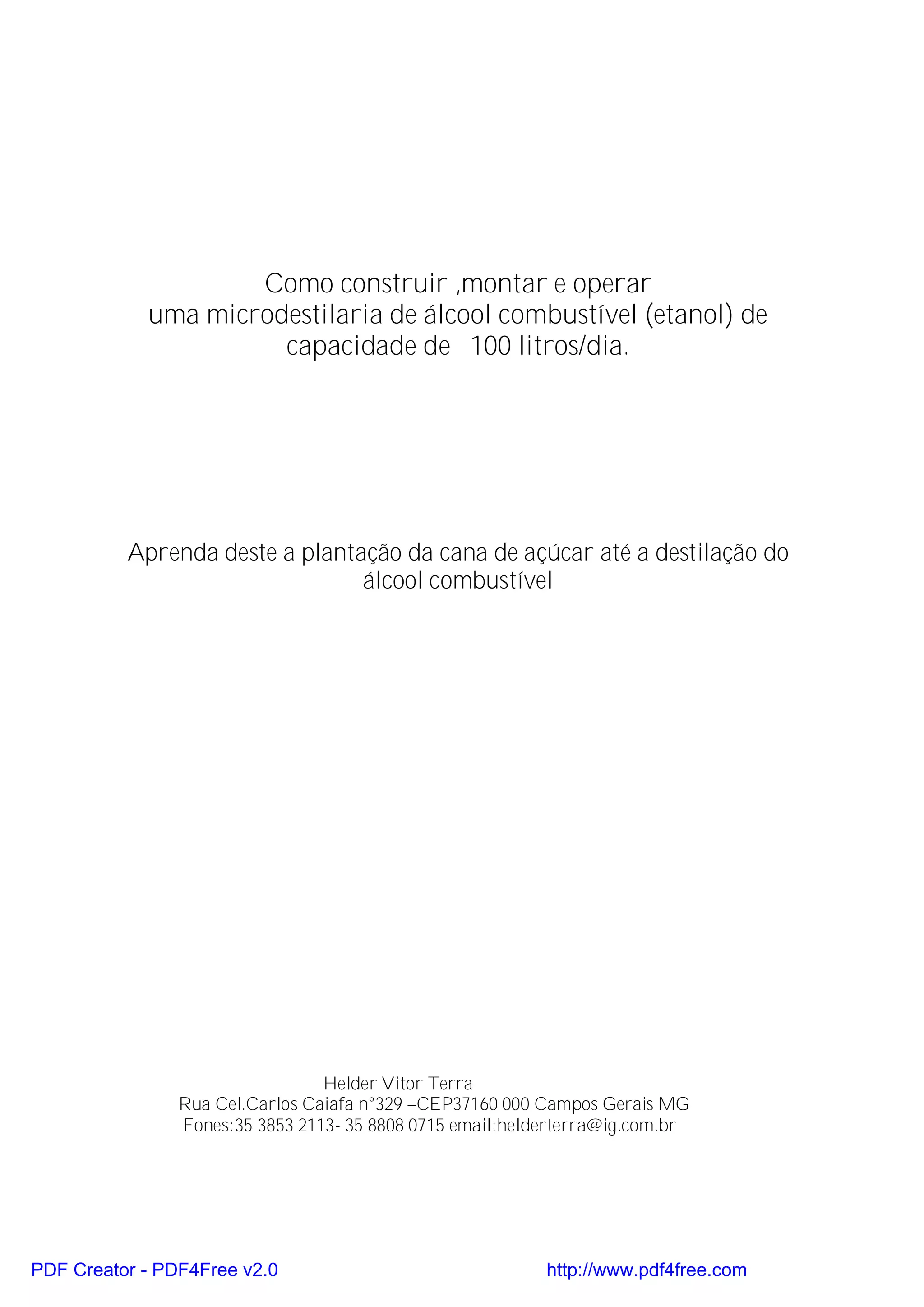 O documento descreve como construir uma microdestilaria de etanol de 100 litros por dia, desde o cultivo da cana-de-açúcar até a destilação do álcool combustível. Ele fornece informações sobre o processo de fermentação da cana para produzir etanol, bem como detalhes sobre a destilação para aumentar a concentração alcoólica.