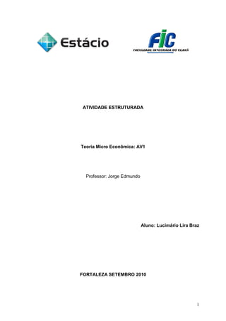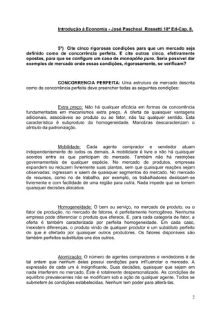 1) O documento descreve as condições necessárias para que um mercado seja considerado de concorrência perfeita ou monopólio puro, citando 5 condições para cada um.