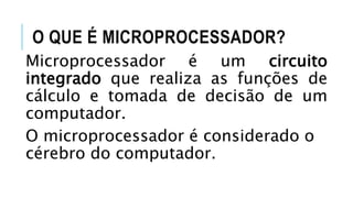 O documento descreve o que é um microprocessador, sua história e tipos. Explica que um microprocessador é um circuito integrado que realiza funções de cálculo e tomada de decisão em um computador e é considerado o cérebro do computador. Também descreve a evolução dos microprocessadores desde 1970 até os dias atuais.