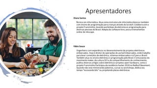 O documento apresenta MicroPython, uma implementação da linguagem Python para microcontroladores. Apresenta os palestrantes Diana Santos e Fábio Souza, descreve brevemente o que é Internet das Coisas (IoT). Explica o que é MicroPython, quais placas são suportadas como Pyboard e micro:bit e demonstra exemplos com as placas ESP8266 e micro:bit.