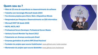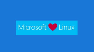 O documento discute a mudança da Microsoft em direção à abertura e colaboração com código aberto. Apresenta a trajetória da Microsoft no apoio a plataformas como Linux, Node.js, Docker e projetos de código aberto em geral. Argumenta que a Microsoft está se tornando a maior empresa de software aberto do mundo ao disponibilizar suas ferramentas de forma multiplataforma e colaborar com a comunidade de código aberto.