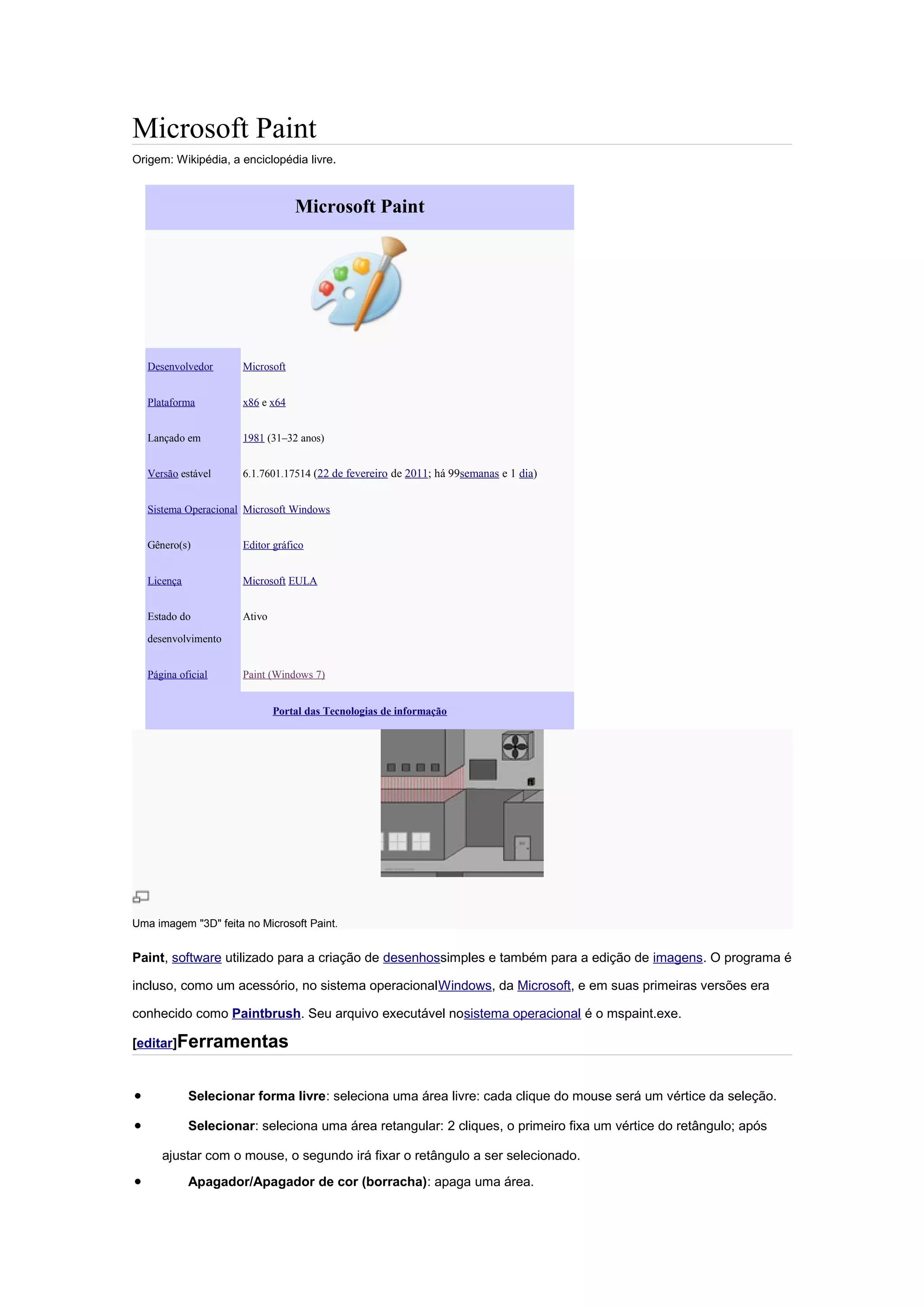 O Microsoft Paint é um editor gráfico simples incluído no Windows desde 1981. Ele permite criar desenhos e editar imagens usando ferramentas como lápis, pincel, spray e formas. O Paint também é usado para pixel art devido às suas ferramentas de edição em pequena escala.