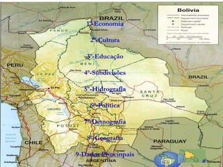 O documento apresenta um resumo sobre a Bolívia, abordando sua economia baseada em gás natural, mineração e banco central, cultura com o Carnaval de Oruro e os Incas, e seu sistema educacional que não tem idade limite. Apresenta também informações sobre as subdivisões do país, hidrografia com lagos e rios, política liderada pelo presidente Evo Morales e dados demográficos.
