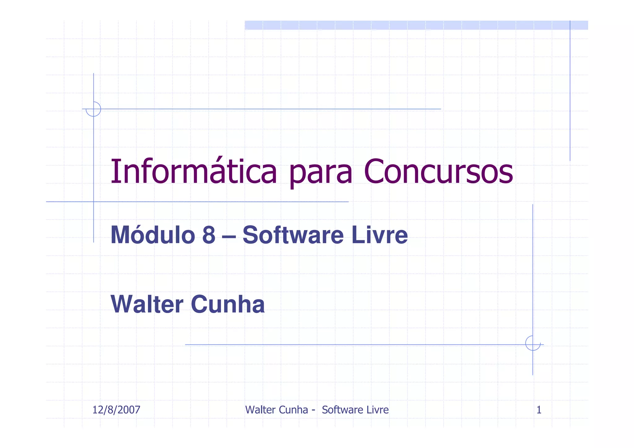 O documento apresenta um módulo sobre software livre ministrado por Walter Cunha, abordando tópicos como o que é software livre, as vantagens e desvantagens, licenças como a GPL, exemplos de softwares livres importantes como Linux, OpenOffice e Firefox. O documento fornece também informações sobre distribuições Linux, shells, diretórios e outros conceitos-chave relacionados a softwares livres.