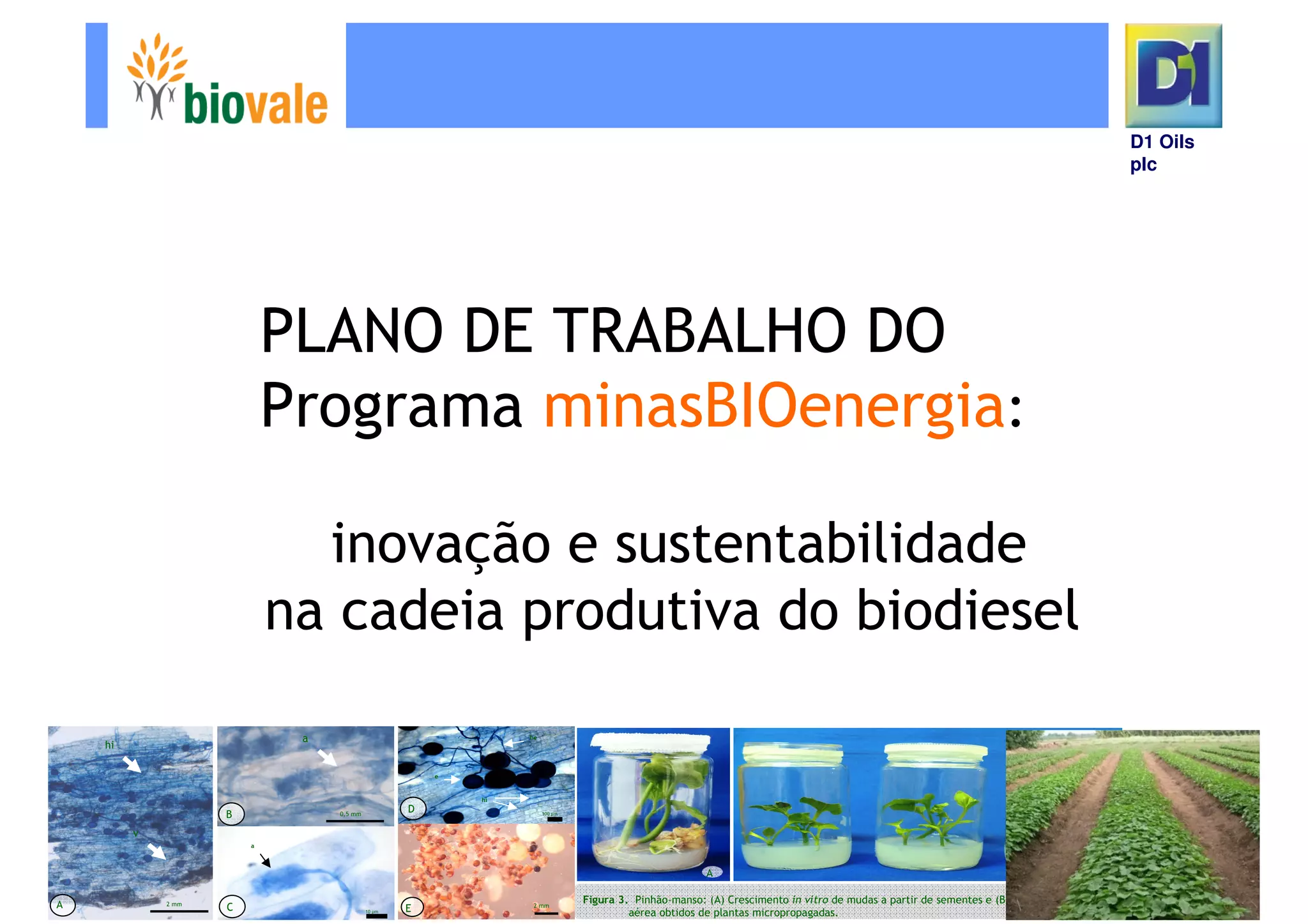O documento descreve o Plano de Trabalho do Programa minasBIOenergia, que tem como objetivo congregar capacitações e interesses de vários agentes envolvidos na cadeia produtiva do biodiesel em Minas Gerais. O programa inclui pesquisas agronômicas, avaliação do pinhão-manso como ração animal, desenvolvimento de fábrica de processamento e pesquisas laboratoriais. O cultivo de pinhão-manso oferece vantagens como ser perene, rústico e ter alto teor de óleo nas se