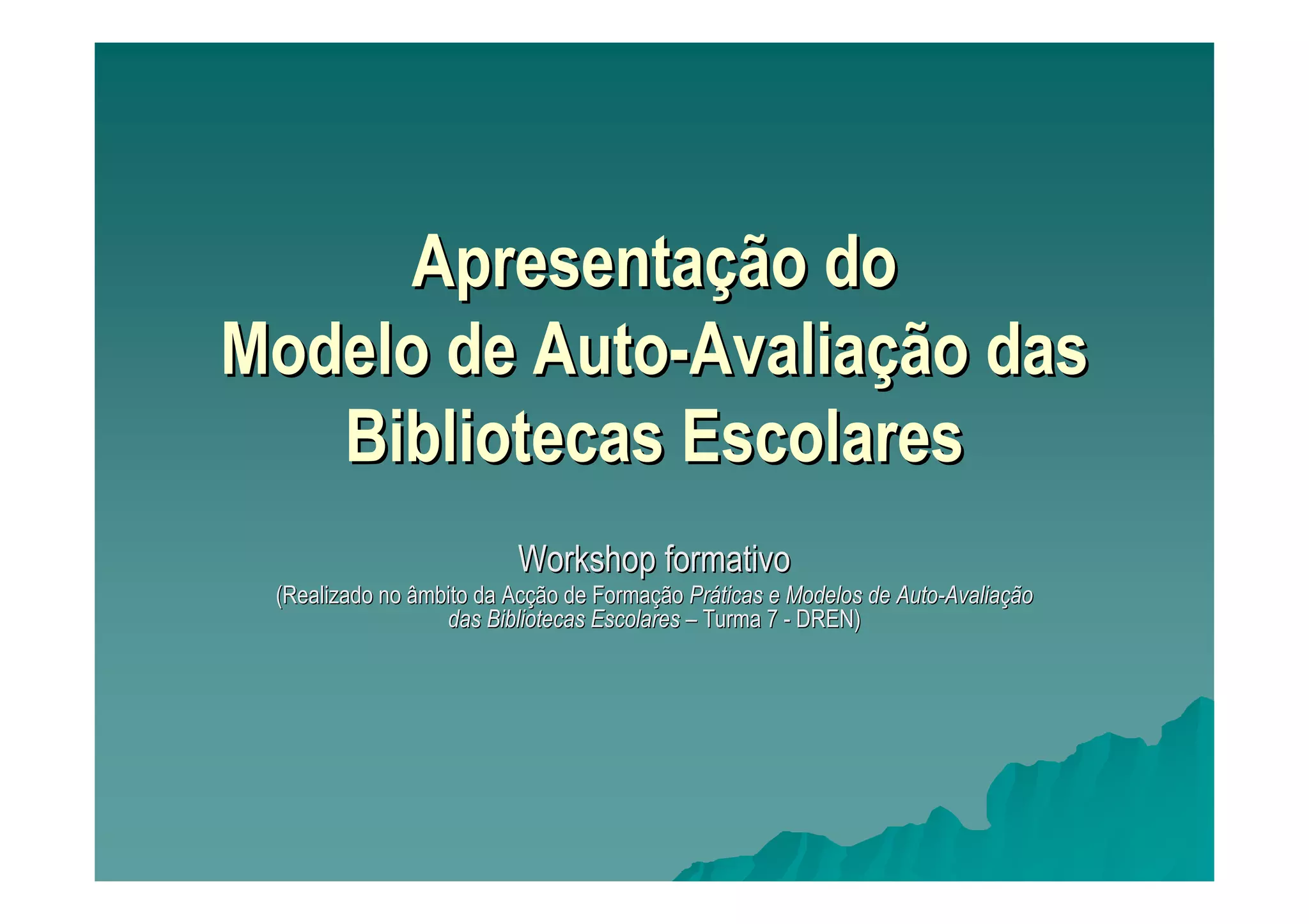 O documento apresenta um modelo de autoavaliação para bibliotecas escolares. Discutem-se os conceitos-chave do modelo como avaliação, autoavaliação, evidência-baseada e construtivismo. O modelo estrutura-se em domínios como apoio curricular, leitura, projetos e gestão. Cada domínio contém indicadores, fatores críticos, instrumentos de coleta de evidências e ações de melhoria. O modelo fornece perfis de desempenho para avaliar o nível de cada biblioteca em cada domínio.