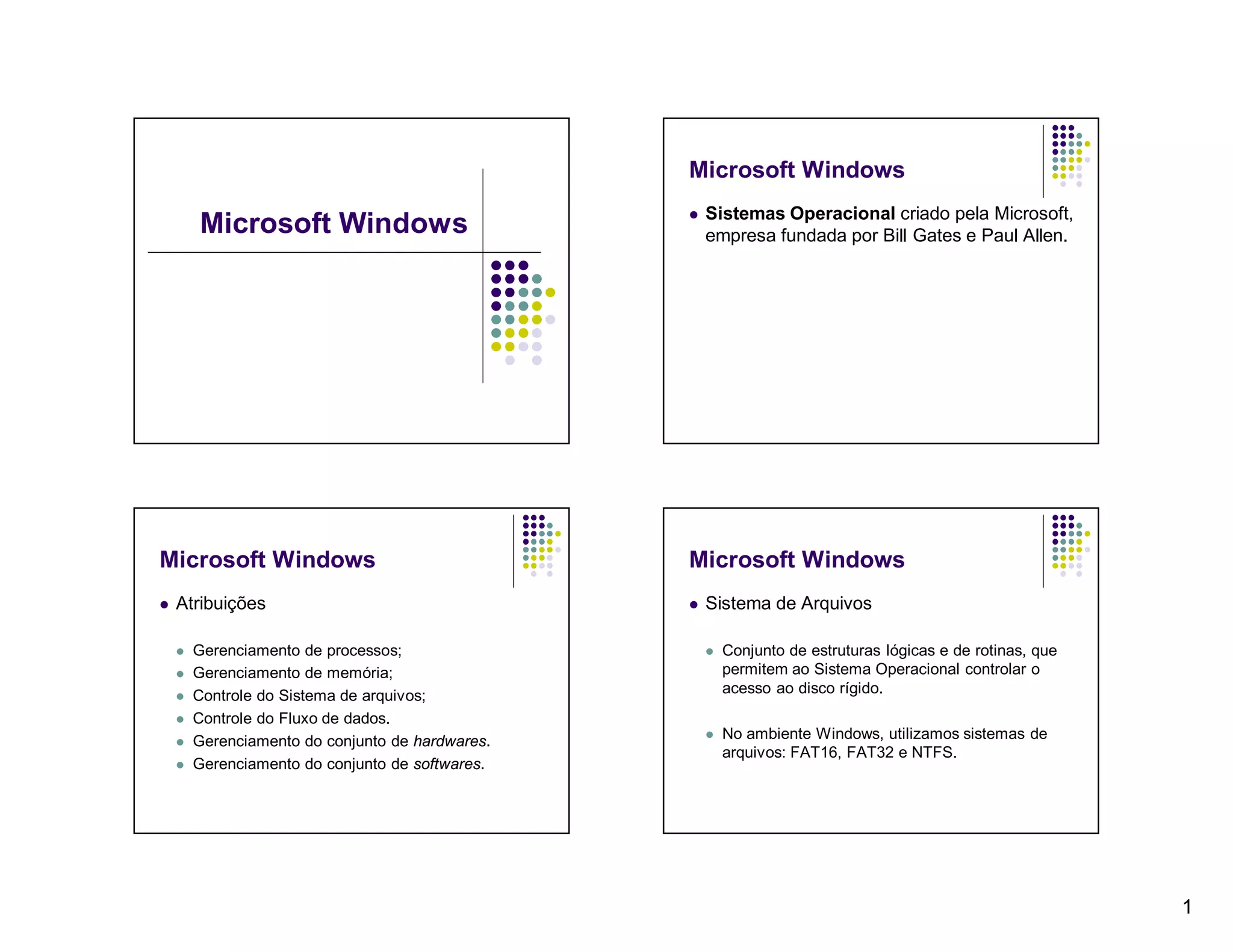 O documento descreve as principais características e evoluções do sistema operacional Microsoft Windows, desde sua criação pela Microsoft até suas versões mais recentes como Windows Vista e Windows XP. Ele explica funções básicas do Windows e ferramentas comuns como o Menu Iniciar, Meu Computador, o Navegador da Web e o Media Player.