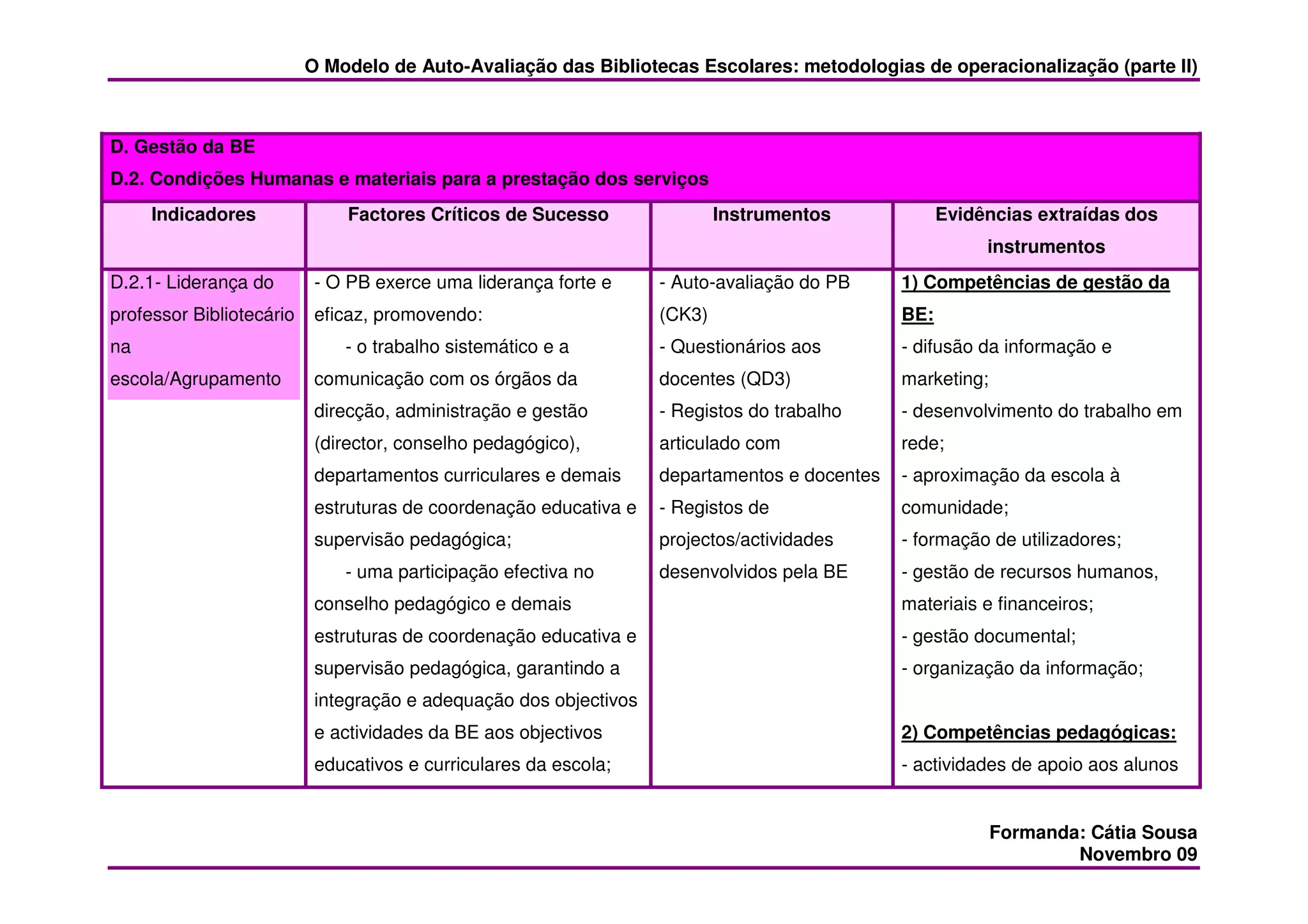 Este documento descreve indicadores e instrumentos para avaliar a gestão e recursos humanos e materiais de bibliotecas escolares. Analisa a liderança do bibliotecário, adequação da equipa, e adequação dos recursos à missão da biblioteca. Fornece exemplos de competências avaliadas e evidências coletadas através de questionários, registos e auto-avaliações.