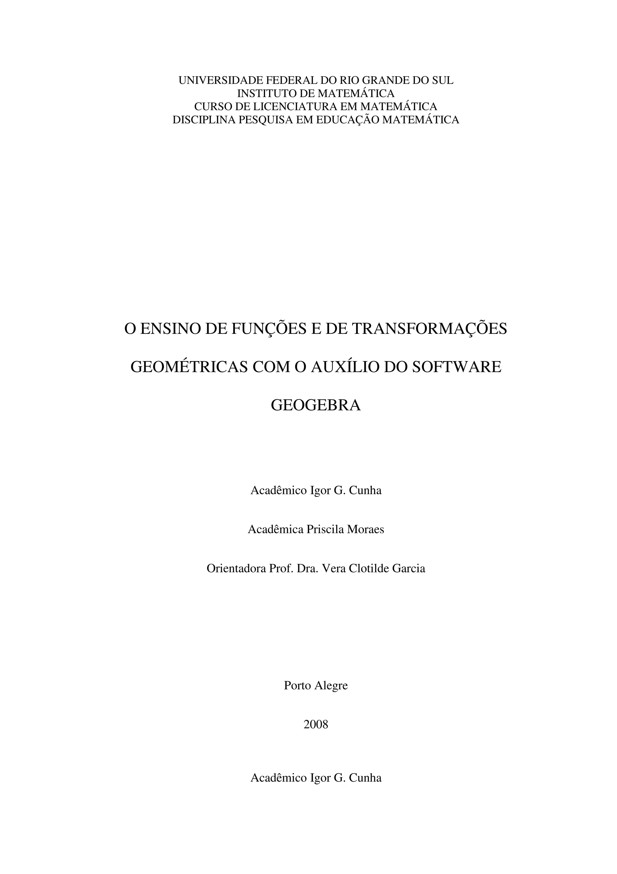 Este documento apresenta uma pesquisa sobre o ensino de funções e transformações geométricas com o auxílio do software GeoGebra. O objetivo é estudar as transformações geométricas euclidianas no plano como exemplos de funções de domínio não numérico, a fim de ampliar o significado usualmente dado às funções. A pesquisa desenvolveu atividades com alunos da Licenciatura em Matemática utilizando o GeoGebra e analisou os resultados obtidos. Concluiu que é possível, em pouco tempo, desenvolver o estudo desej