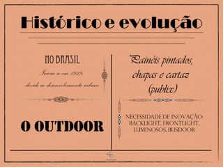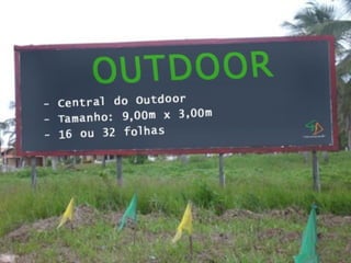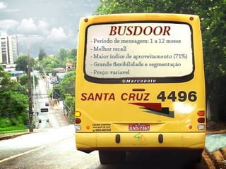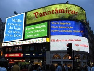 O documento fornece informações sobre publicidade exterior no Rio de Janeiro, incluindo preços de cartazes duplos nas três zonas da cidade e detalhes sobre o projeto Cidade Limpa que proíbe a maioria das mídias externas na capital para reduzir a poluição visual.