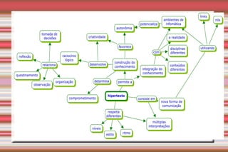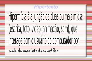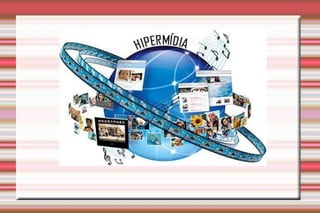 O documento discute hipermídia, definindo-a como texto, som, imagem em movimento e outras mídias que facilitam a busca do usuário por determinados temas. Explica que o rádio tem dificuldade em se relacionar com outras mídias por ser somente sonoro, e que a hipermídia provavelmente não mudará muito nos próximos séculos devido ao avanço da tecnologia, permitindo que os usuários acompanhem a velocidade crescente da informação.