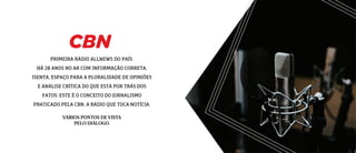 A CBN é a primeira rádio allnews do país com 28 anos no ar fornecendo informações corretas, imparciais e análises críticas. É a rádio mais admirada do Brasil e oferece programação multiplataforma cobrindo notícias, esportes, saúde e outros temas. A CBN também desenvolve projetos personalizados para marcas se conectarem com sua grande audiência.