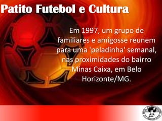 O Patito Futebol e Cultura começou em 1997 como um jogo semanal entre amigos, crescendo para se tornar uma equipe oficial fundada em 2013. Sua missão é promover cultura, esporte e lazer através do futebol, realizando jogos beneficentes e buscando resultados positivos. O documento apresenta as cidades onde jogaram, grandes momentos, estatísticas e oferece opções de patrocínio.