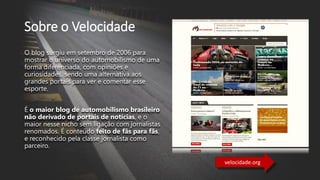 O documento fornece informações sobre o blog Velocidade, incluindo sua história, equipe, conteúdo, audiência e opções de publicidade. Resume as seguintes informações essenciais: