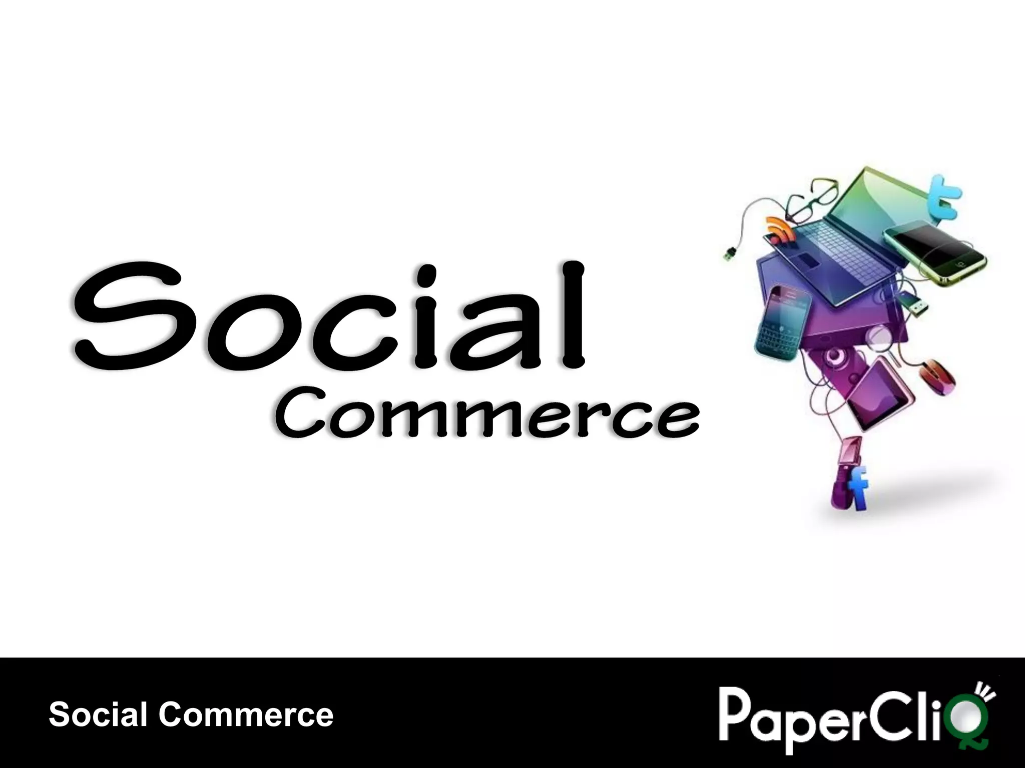 O documento discute o conceito de Social Commerce, resumindo-o como o uso das mídias sociais para influenciar decisões de compra. Apresenta os 6 principais âmbitos de atuação do Social Commerce, como compras sociais, classificações e recomendações. Também discute dados sobre e-commerce no Brasil e o potencial das mídias sociais para influenciar consumidores.