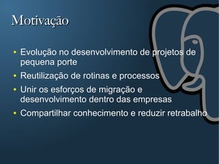 Este documento discute a migração colaborativa para o PostgreSQL, incluindo os motivos para migrar, como o PostgreSQL oferece suporte da comunidade, escalabilidade e segurança. Ele também descreve o processo de migração, incluindo identificação, planejamento, análise e execução, além de ferramentas que podem ajudar no processo. Finalmente, discute os diferentes tipos de projetos de software livre e repositórios onde encontrar ferramentas para migração.