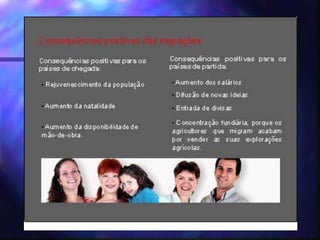 Migrações populacionais ocorrem desde os tempos pré-históricos, quando humanos migraram da África para povoar outros continentes. As migrações podem ser internas, dentro de um país, ou externas para outro país, e são causadas por fatores econômicos, como falta de oportunidades, ou por conflitos. A atual crise econômica global levou a uma reversão dos fluxos migratórios, com imigrantes retornando aos seus países de origem.