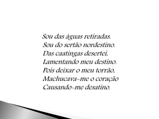 O poema descreve a saudade de uma pessoa do sertão nordestino que se mudou para longe de sua terra natal. Ela sente tristeza por deixar para trás seu dialeto, costumes e comidas típicas, mas mantém viva a cultura nordestina em sua nova casa através de objetos e pratos tradicionais. Um dia ela sonha em retornar para viver novamente em seu amado Ceará.