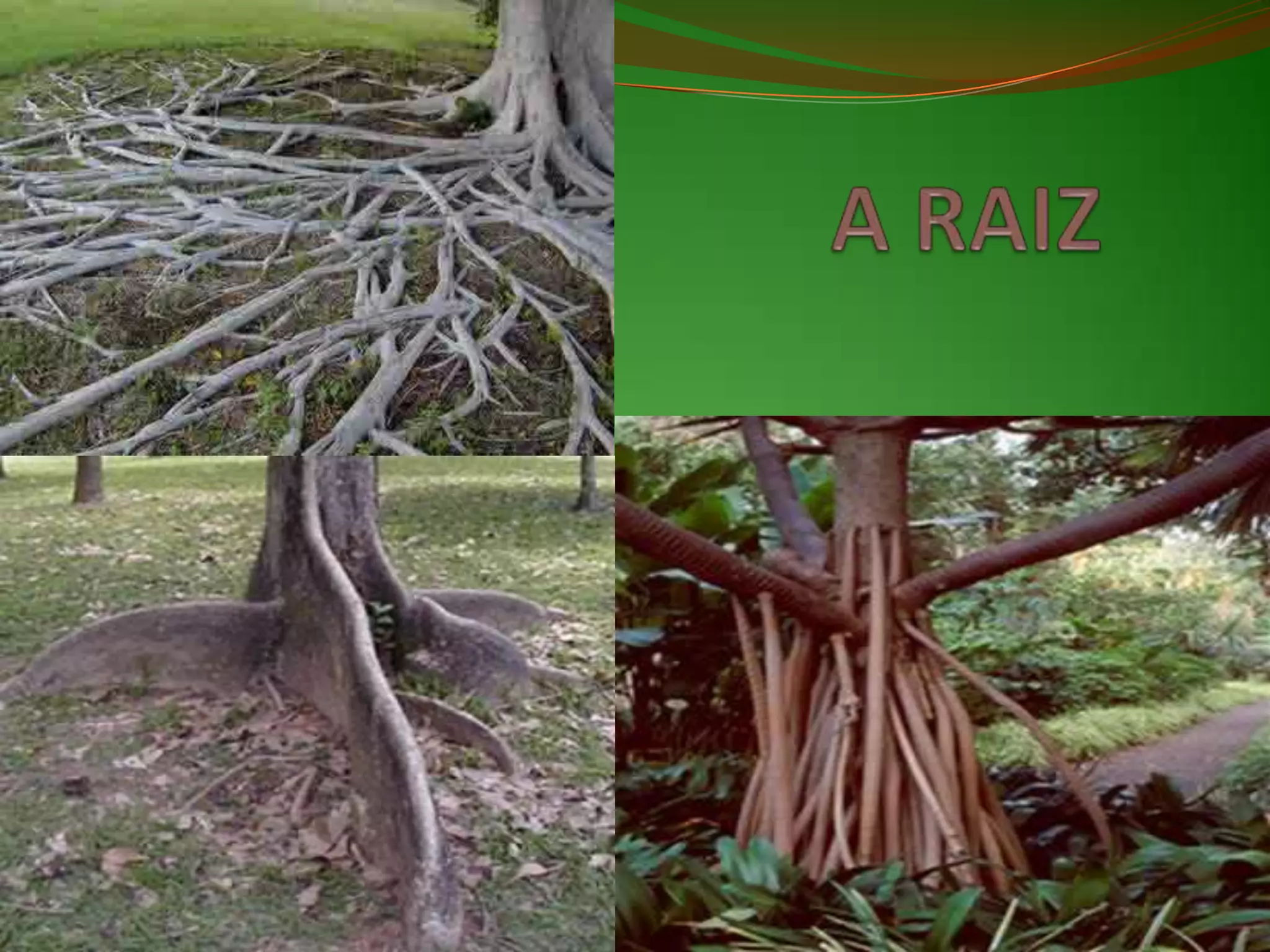 O documento descreve as funções e tipos de raízes de plantas. Apresenta as funções da raiz como fixar a planta, absorver água e nutrientes e armazenar reservas. Detalha a constituição típica da raiz e existem de raízes subterrâneas, aéreas e aquáticas, com exemplos como a cenoura e raízes estranguladoras.