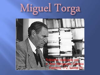 Miguel Torga nasceu em 1907 em Trás-os-Montes e tornou-se um famoso escritor português. Formou-se em medicina em 1933 e exerceu a profissão em várias cidades, mas também se dedicou à escrita desde 1928. Publicou diversas obras literárias ao longo de sua carreira e recebeu vários prêmios importantes por sua contribuição à literatura portuguesa.