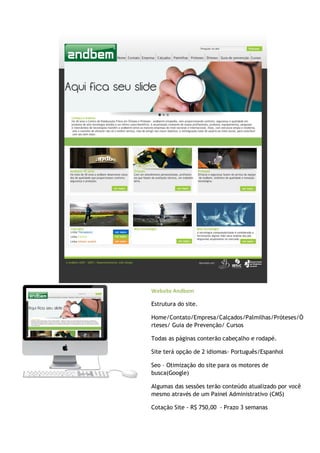 O documento apresenta diretrizes para a criação de dois sites, Sannabem e Andbem, com estruturas definidas e opções de idioma em português e espanhol. Ambos os sites incluirão cabeçalhos, rodapés, otimização para motores de busca e conteúdo que pode ser atualizado pelo usuário através de um painel administrativo. As cotações para os sites são R$ 800,00 com prazo de 4 semanas para Sannabem e R$ 750,00 com prazo de 3 semanas para Andbem.