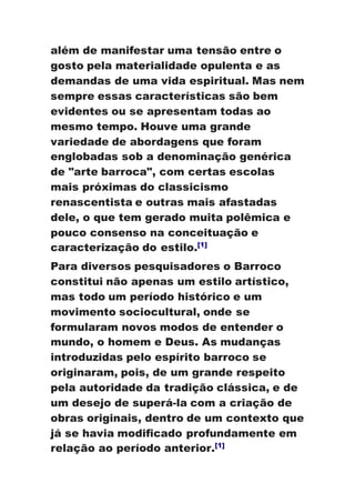 O documento descreve o estilo artístico Barroco que floresceu entre os séculos XVI e XVIII na Europa e Américas. O Barroco se distinguiu pelo esplendor exuberante e maior dinamismo em comparação ao Renascimento, refletindo os tempos turbulentos após a Reforma Protestante e a Contrarreforma Católica.