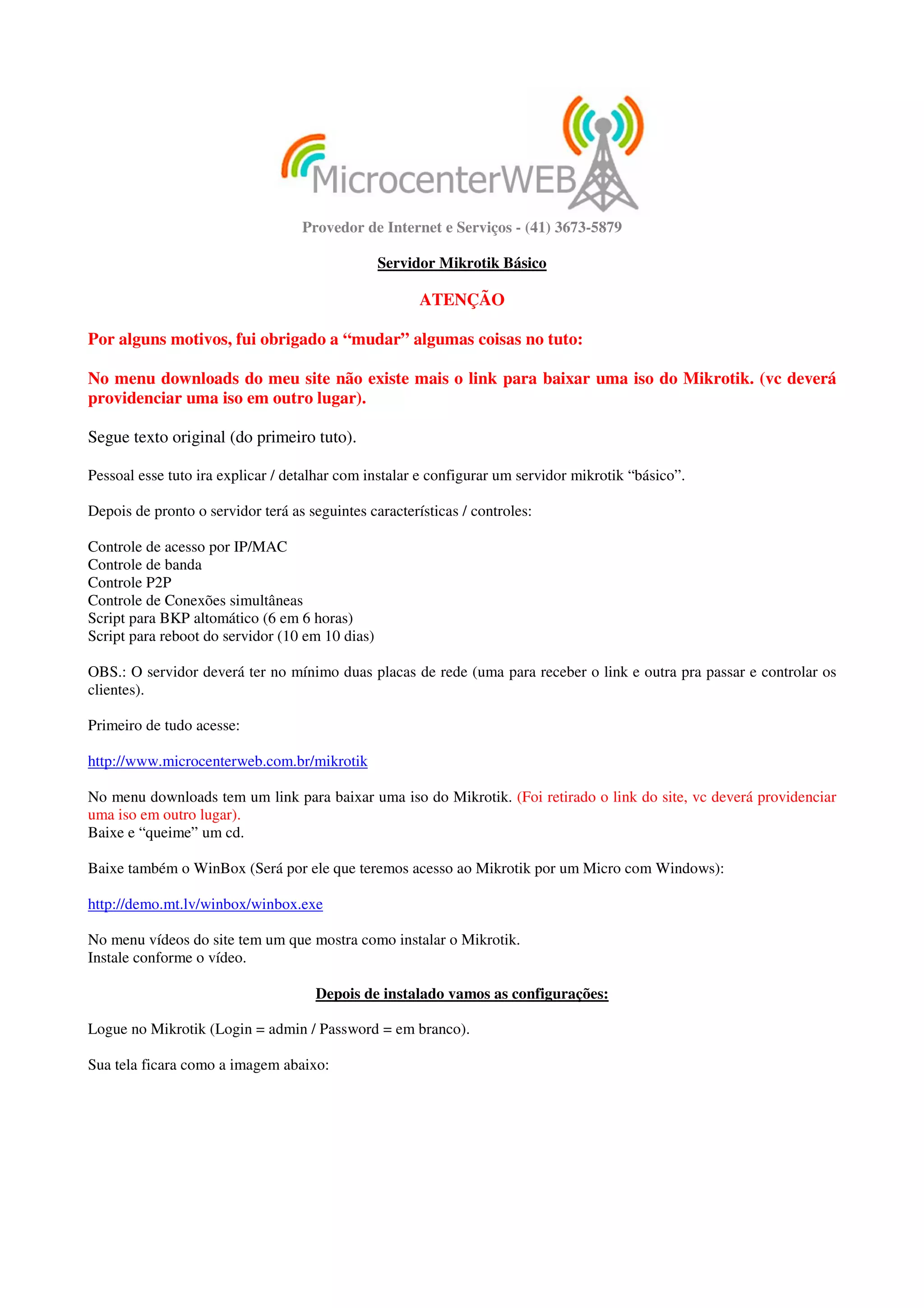 2) Inclui etapas como instalação do Mikrotik, configuração de interfaces de rede, endereços IP, roteamento, DNS e NAT.