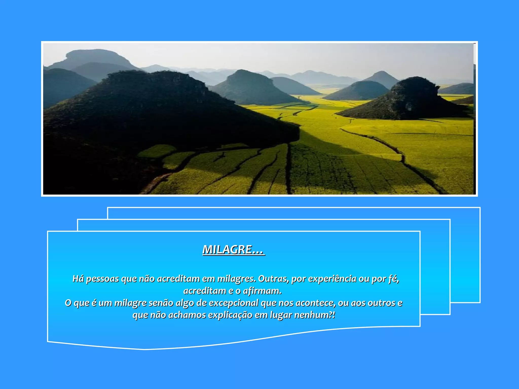 O documento discute a existência de milagres na vida cotidiana, como o nascimento de um bebê, o crescimento de uma árvore a partir de uma semente, e os espetáculos da natureza como o nascer e pôr do sol. Defende que ter fé e apreciar as belezas ao redor pode tornar as pessoas mais felizes.