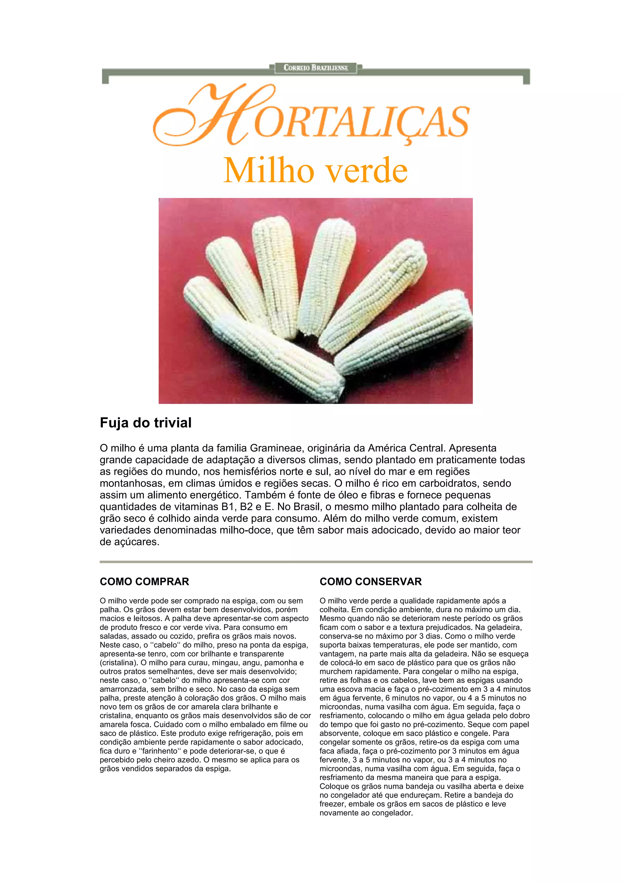 O milho é uma planta originária da América Central que se adapta a diversos climas e é cultivada em todo o mundo. É rico em carboidratos e fornece energia, além de vitaminas e fibras. No Brasil, o milho é colhido verde para consumo, sendo mais adocicado em algumas variedades.